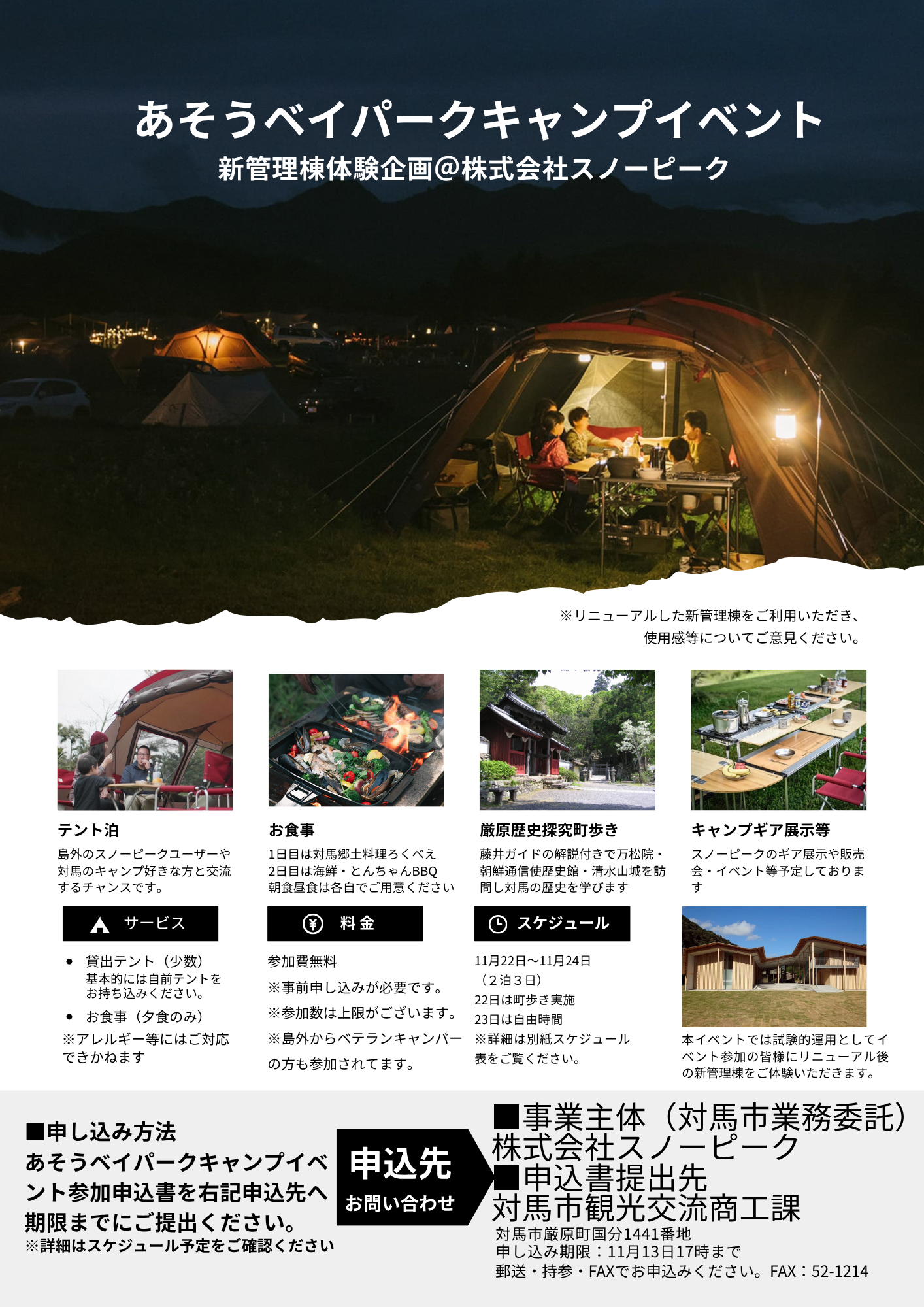 現在リニューアル整備中のあそうベイパークにおいて、新管理棟の供用開始前のテスト利用として、2泊3日のキャンプイベントを開催いたします。