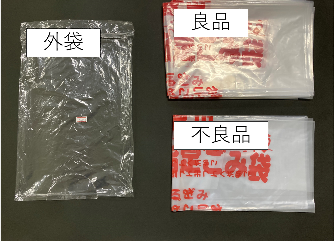 不良品のごみ袋を含めた残り全てのごみ袋、不良品のごみ袋が出た外袋の持ち込みをお願いします。