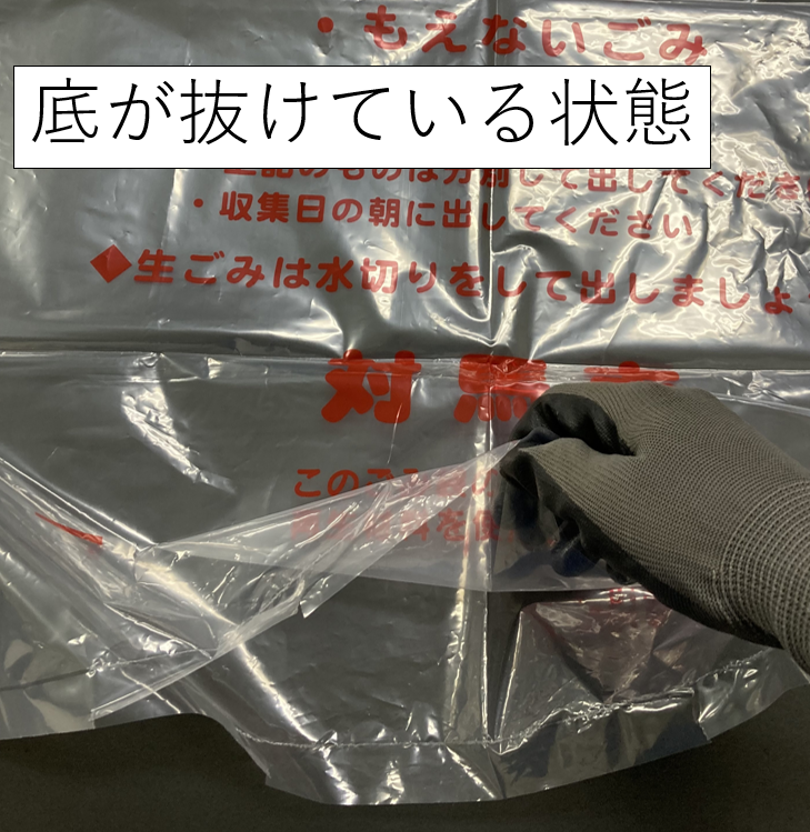 現在、指定ごみ袋(大)で底抜けする不良品が複数確認されております。