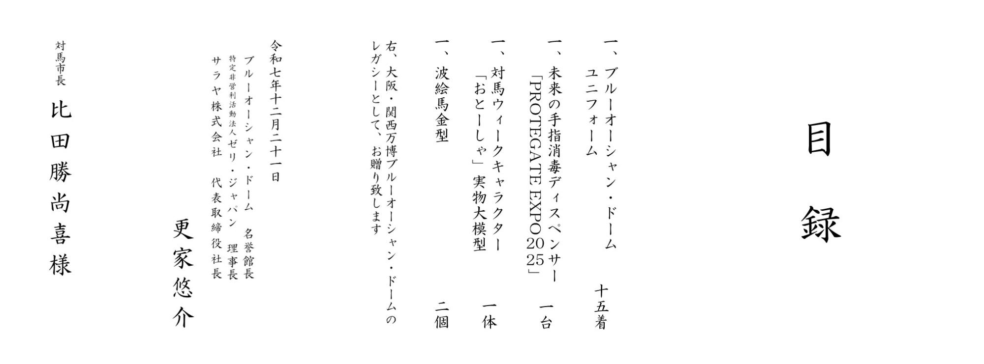 2025年12月21日、「対馬未来フォーラム2025」のステージイベント「大阪・関西万博を通じた対馬の未来共創~万博の成果と未来への展望を語る~」に合わせて寄附受納式を執り行い、BLUE OCEAN DOMEの館長である更家一徳様(サラヤ株式会社取締役副社長)より対馬市長へ直接寄附物品を手渡しいただきました。