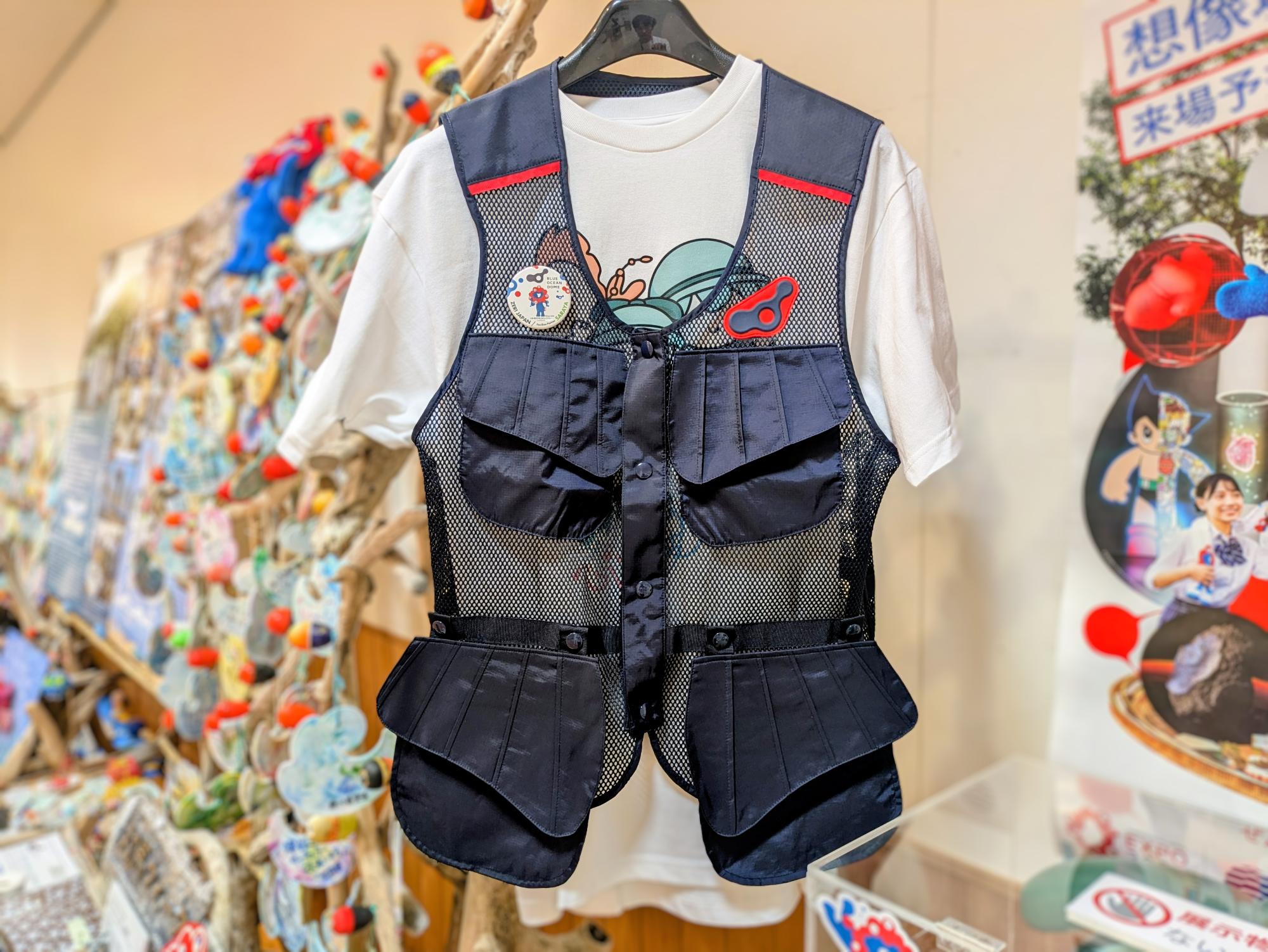 1の物品は、BLUE OCEAN DOMEのスタッフが実際に着用していたユニフォームです。海にちなんだネイビーカラーのベストで、魚のヒレのようなあしらいを施した取り外し可能なポケットが特徴です。万博終了後も海に関わる人々を中心に永く活用していただけるようデザインされたものであり、対馬の海の社会課題解決に取組む方々に活用いただければ幸いです。
