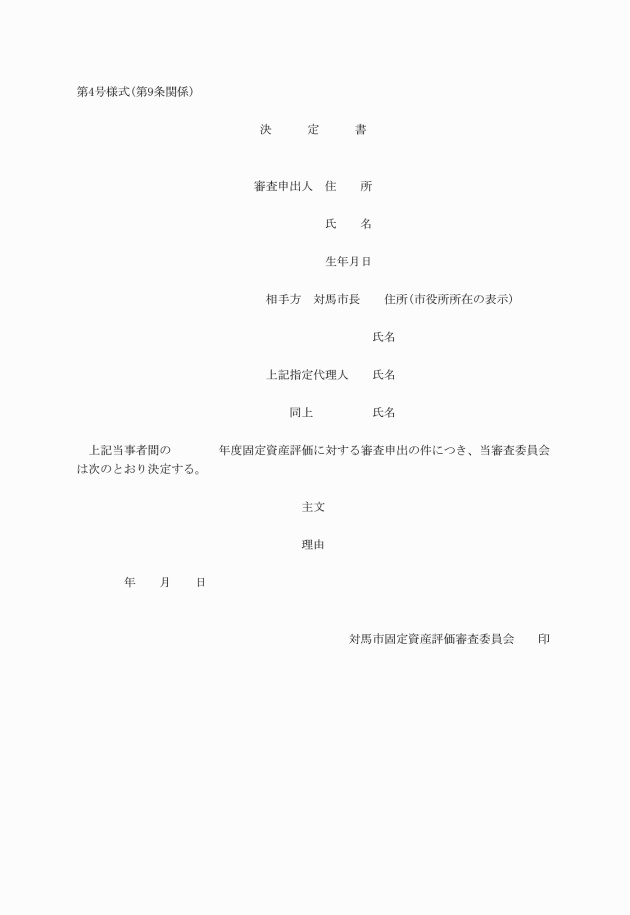 第3条 対馬市固定資産評価審査委員(以下「委員」という。)の所属する合議体は、委員会で定める。