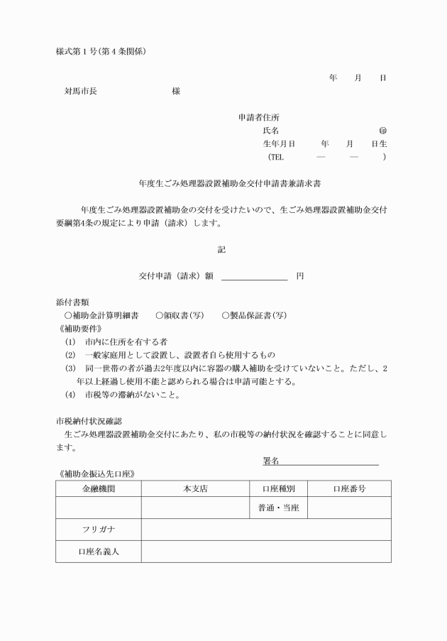 第4条 補助金の交付申請をしようとする者は、生ごみ処理器設置補助金交付申請書兼請求書(様式第1号。以下「申請書」という。)に処理器購入を証する領収書及び製品の保証書を添付し、市長に提出しなければならない。